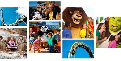 全新鋼鐵太攀蛇 Steel Taipan 及其他各式雲霄飛車: The Gold Coaster, Moto Coaster. Giant Drop澳洲大怒神. The Claw 神奇魔掌. Tower of Terror II-全世界最快衝刺的遊戲.保證過癮.世界第一.Tail Spin-旋轉世界. 夢幻世界劇院. 夢幻世界號火車. 功夫熊貓超級摩托過山車. 史瑞克的遠的要命王國. 馬達加斯加的冒險叢林.與卡通明星合影留念
